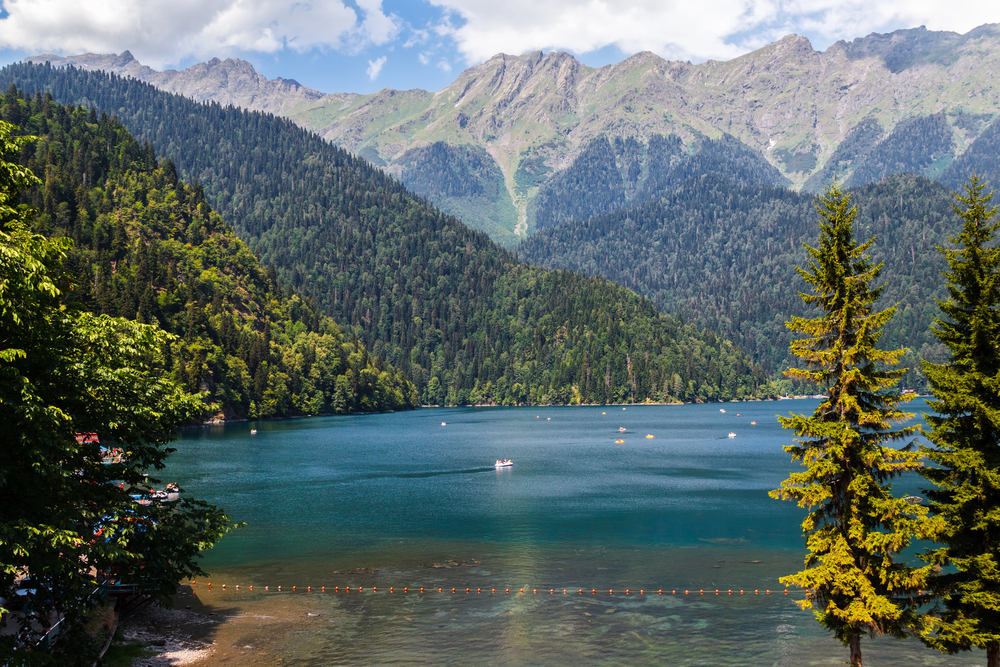 Поднявшись на высоту 1000м над у.м., автобус спускается к котловине, где и расположено безмятежное, играющее различными оттенками зеленого цвета озеро Рица – жемчужина Кавказа. Вы можете прогуляться у берегов озера, здесь же и пообедать.